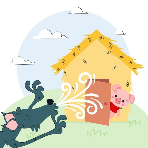 El lobo sopló y resopló con todas sus fuerzas y la casita de paja se vino al piso. Afortunadamente, el cerdito menor había escapado hacia la casa del cerdito del medio mientras el lobo seguía soplando.